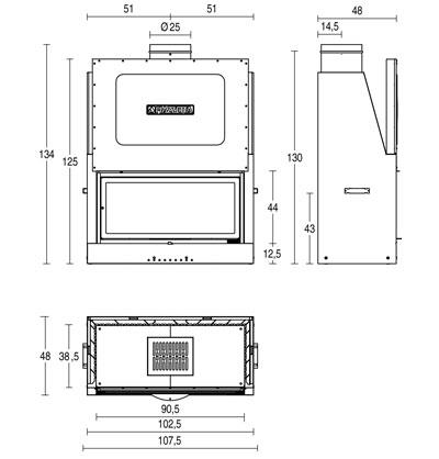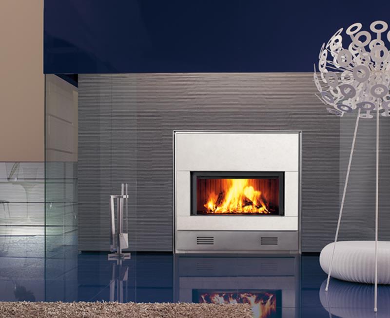 Cornice in pietra Zen levigata, rialzo e profili in Acciaio pallinato. All’interno troviamo il focolare MA 263 SL