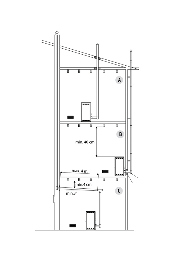 SOLUZIONE C: in questo caso esiste già una canna fumaria nell’edificio ed è sufficiente realizzare un raccordo fumi con un determinato andamento per raggiungerla; il raccordo è il più verticale possibile se parliamo di prodotti a legna, può essere anche quasi orizzontale con una leggera inclinazione se parliamo di prodotti a pellet.