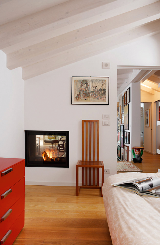 SOLUZIONE A: la canna fumaria “buca” il solaio e raggiunge direttamente il colmo del tetto; è la soluzione più semplice quando si vive in un attico all’ultimo piano.