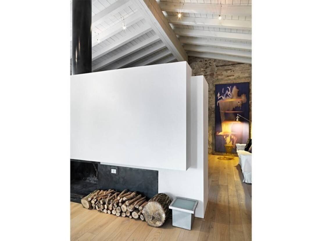 Qui ci troviamo di fronte ad una ristrutturazione di un’abitazione non propriamente nuovissima. Si tratta infatti di una cascina del XIX secolo inserita in un contesto rurale, tra le colline della Valtenesi, entroterra del Benaco. Anche qui si è scelto di dare alla casa un volto moderno e per completare il tutto, cosa potrebbe essere meglio di un grande camino alimentato a legna, ma dalle forme squadrate e i materiali moderni?