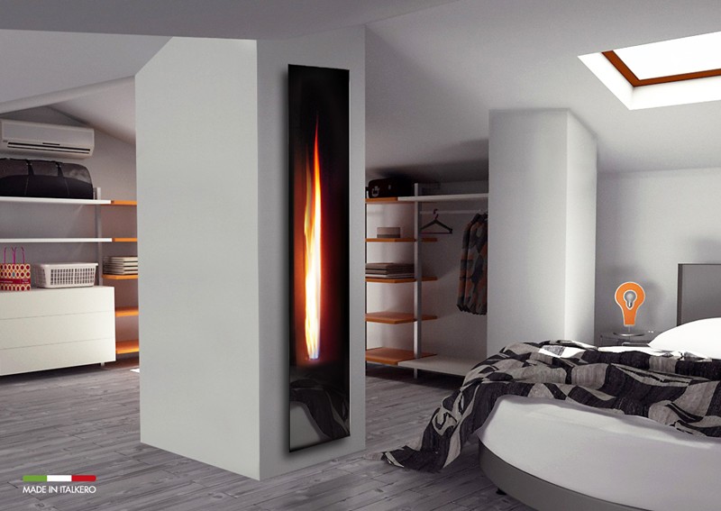 Quando è spento questo camino è un fantastico specchio nero, appena acceso diventa una splendida torcia di fiamma.