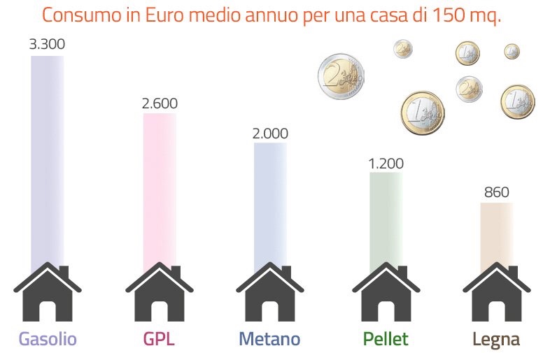 Il pellet consente di risparmiare notevolmente non solo rispetto al gasolio ed al GPL ma anche al metano, combustibile utilizzato come riferimento in quanto una delle fonti di riscaldamento più utilizzate.